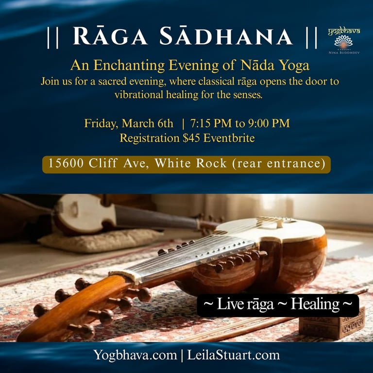 8:45 PM — Departure | This evening is curated as a listening-based yogic healing, where sound functions as medicine and inquiry into the deeper layers of the energy and emotional body. The intention is contemplative reception—allowing rāga, resonance, and silence to work together as a healing and reflective practice.